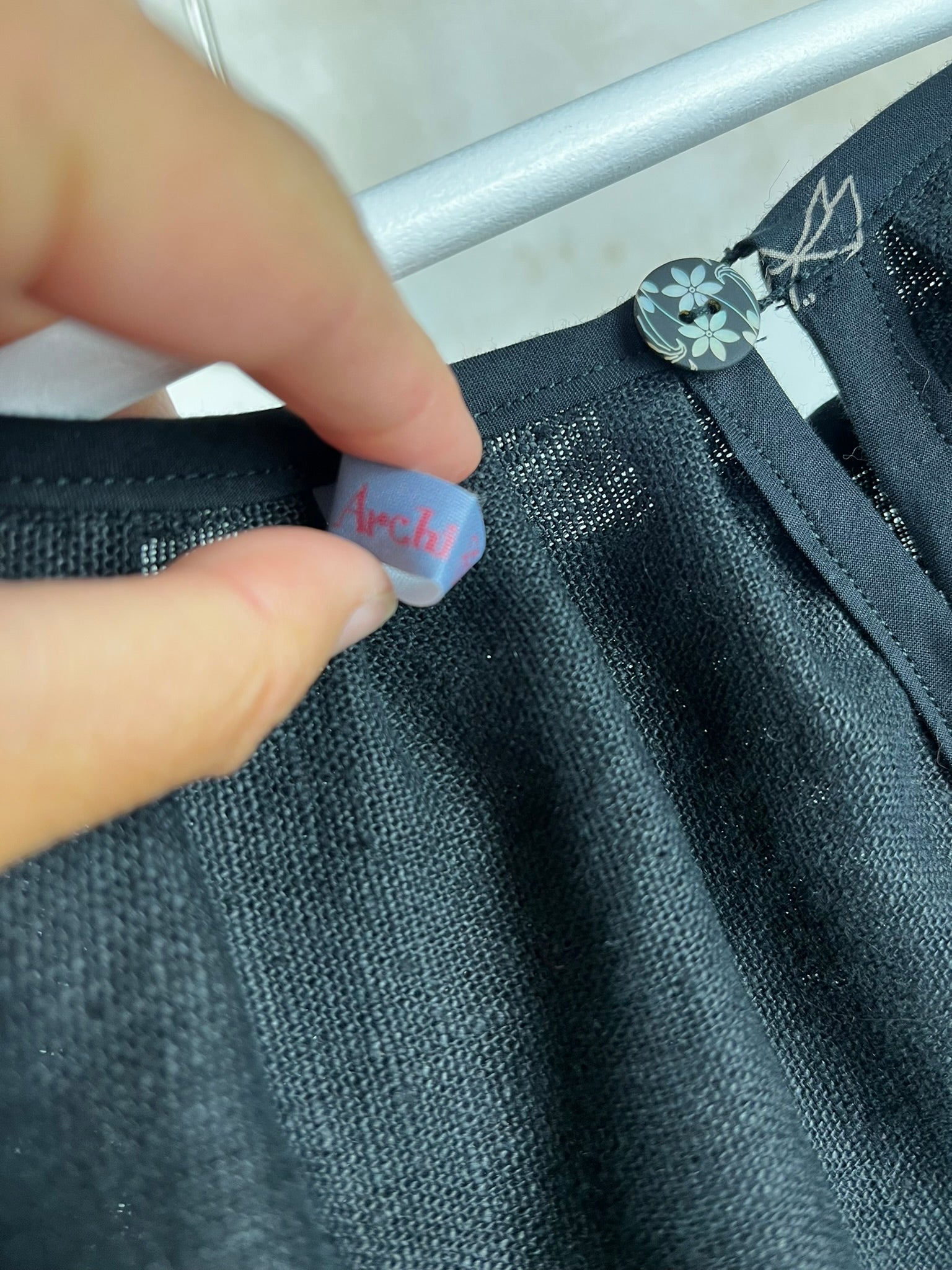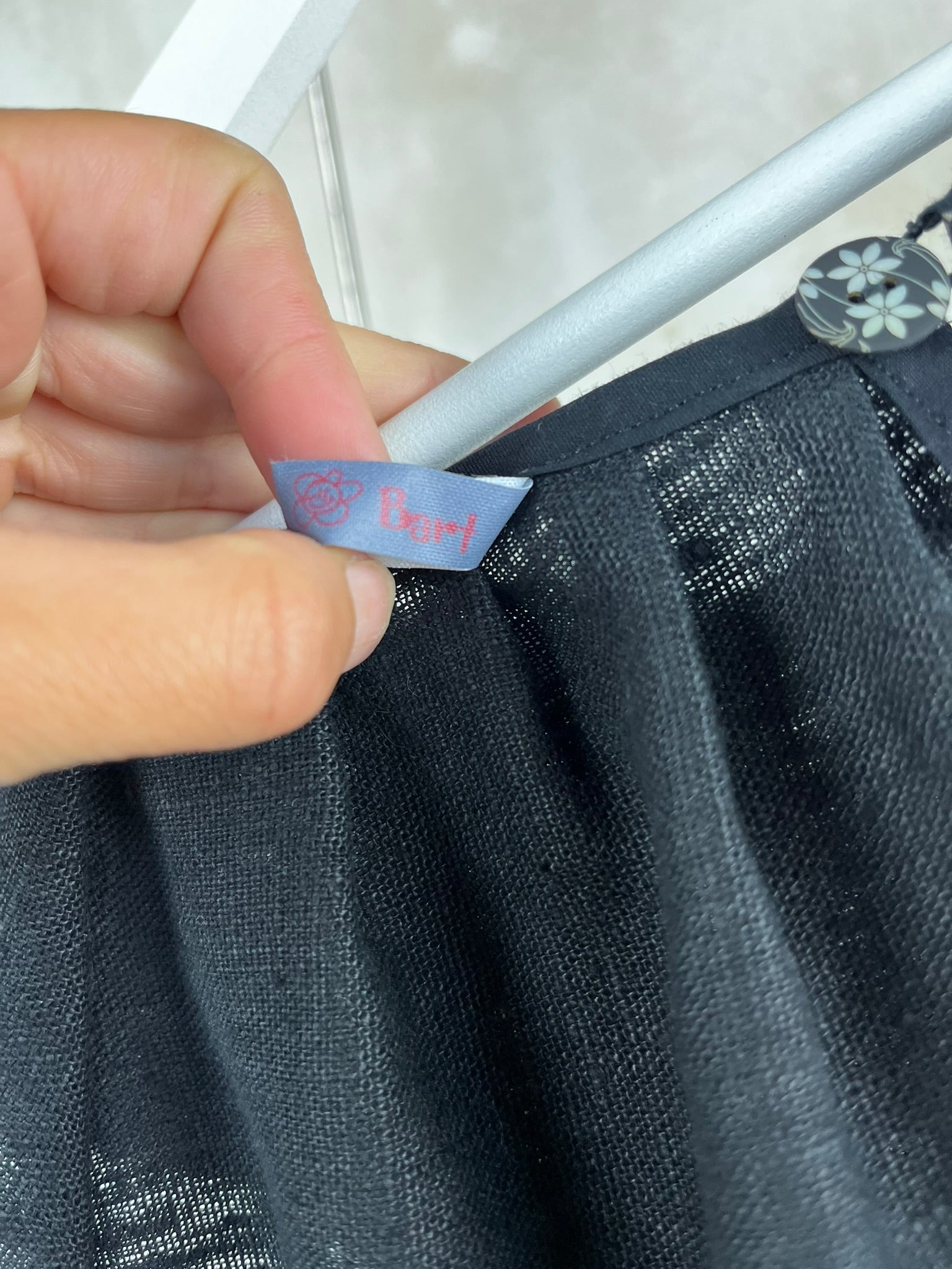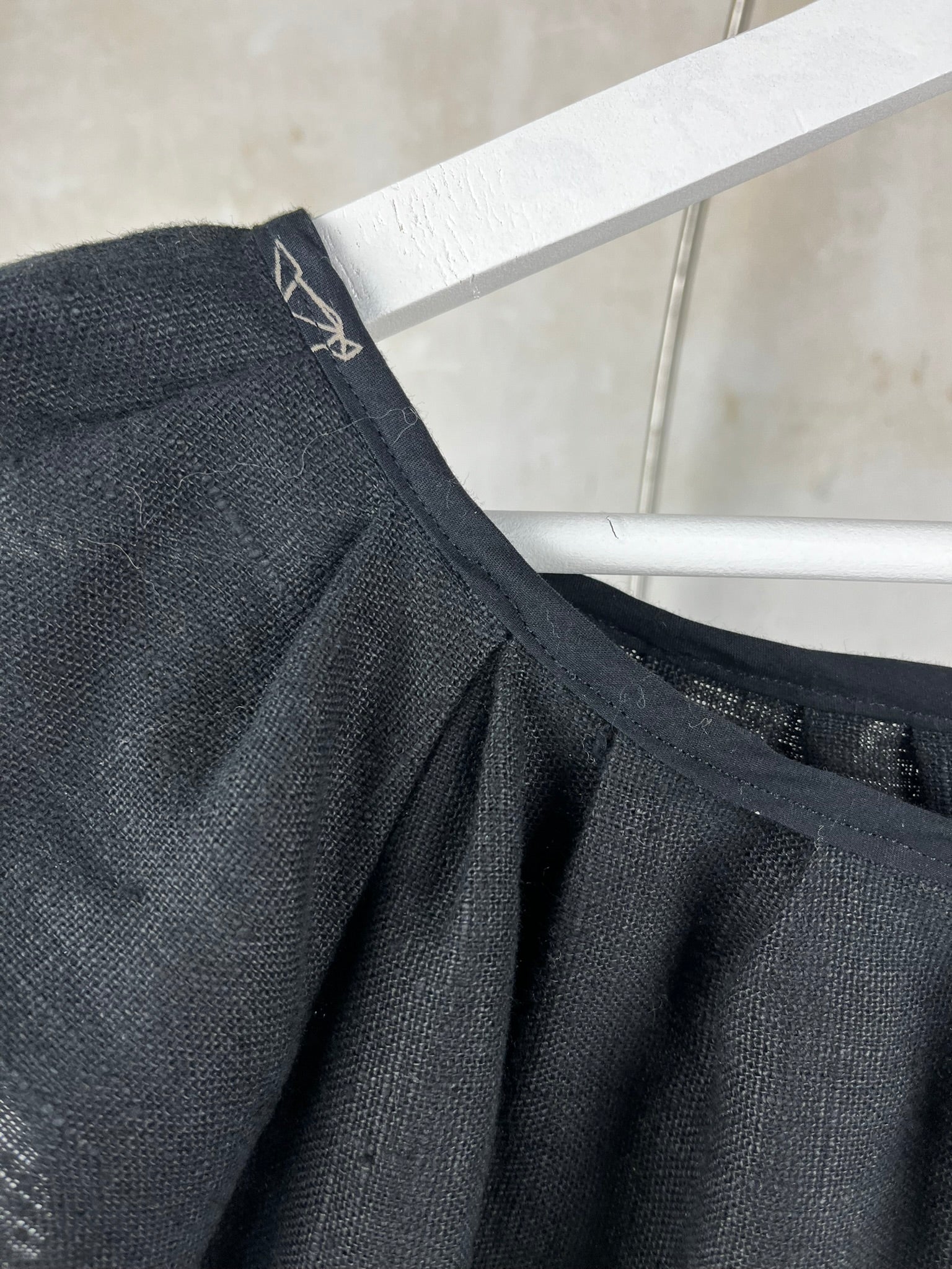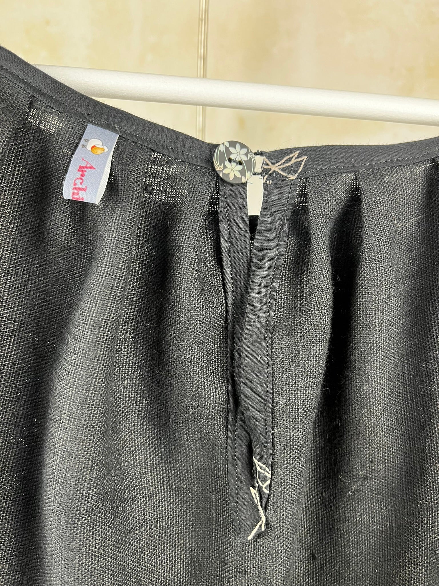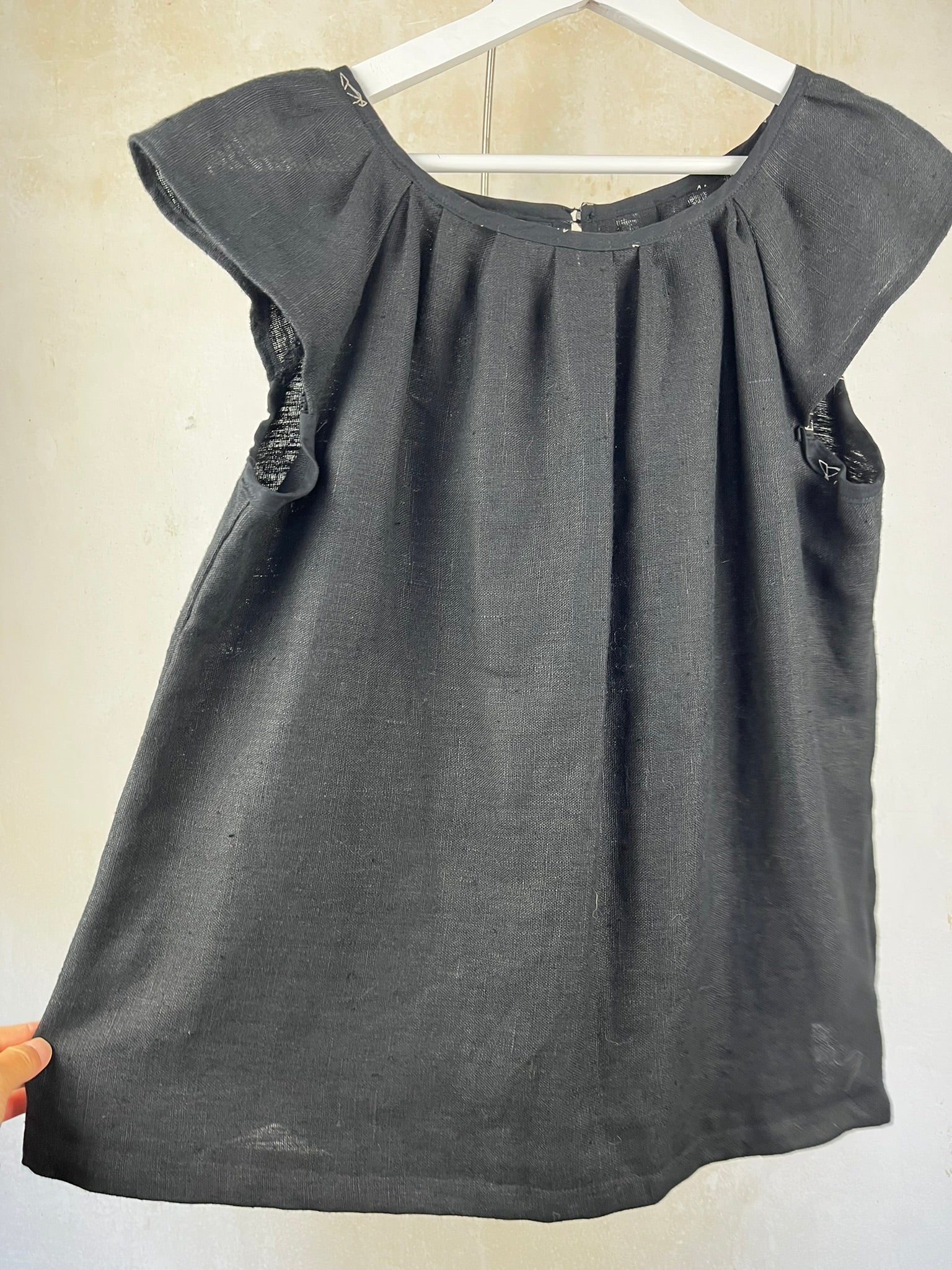 Superbe blouse noire, parfaite pour les beaux jours ou pour une touche d'élégance décontractée ! Confectionnée avec soin dans un tissu léger, probablement un lin fin ou un mélange de lin, elle offre un tombé fluide et agréable à porter