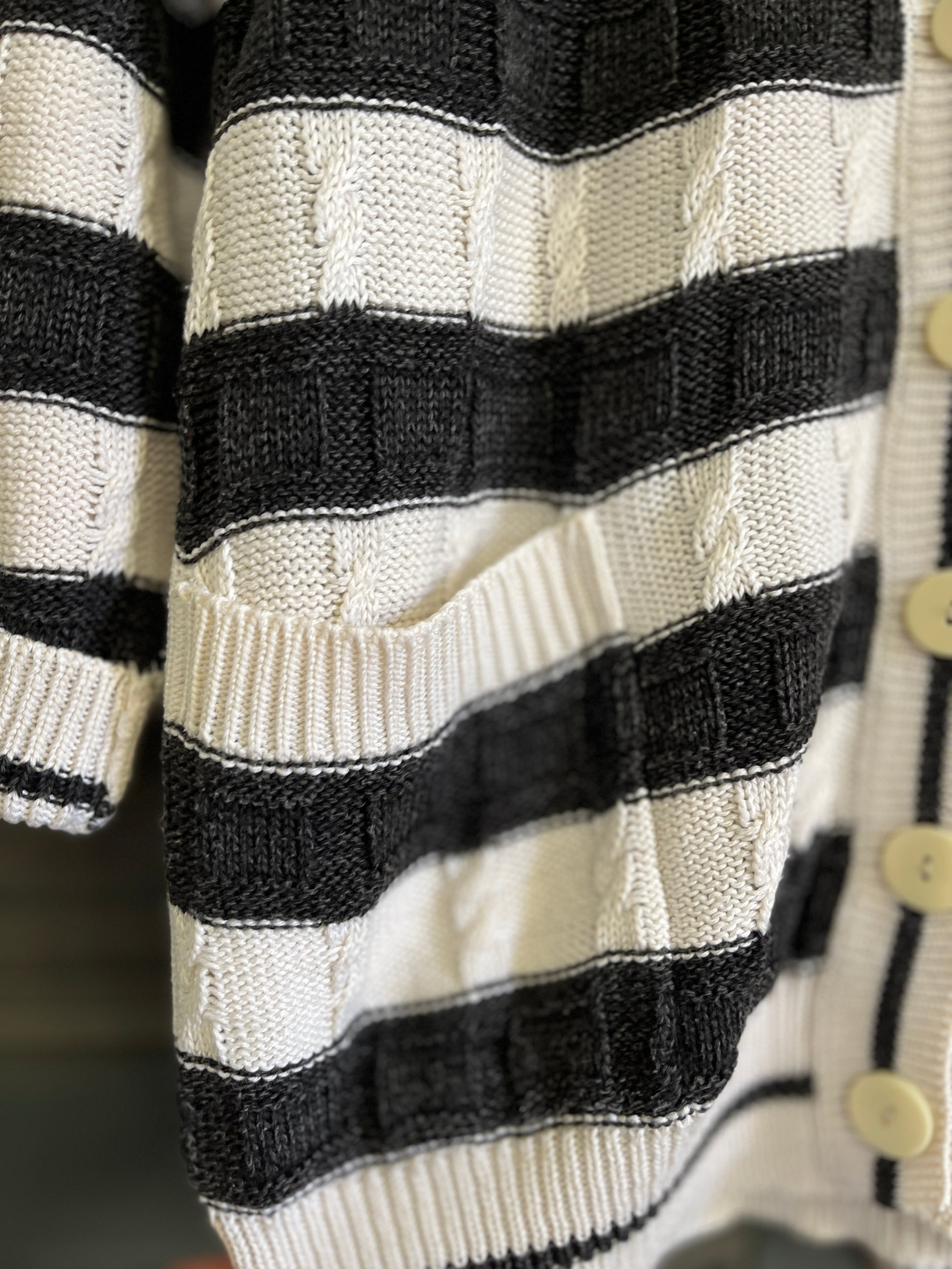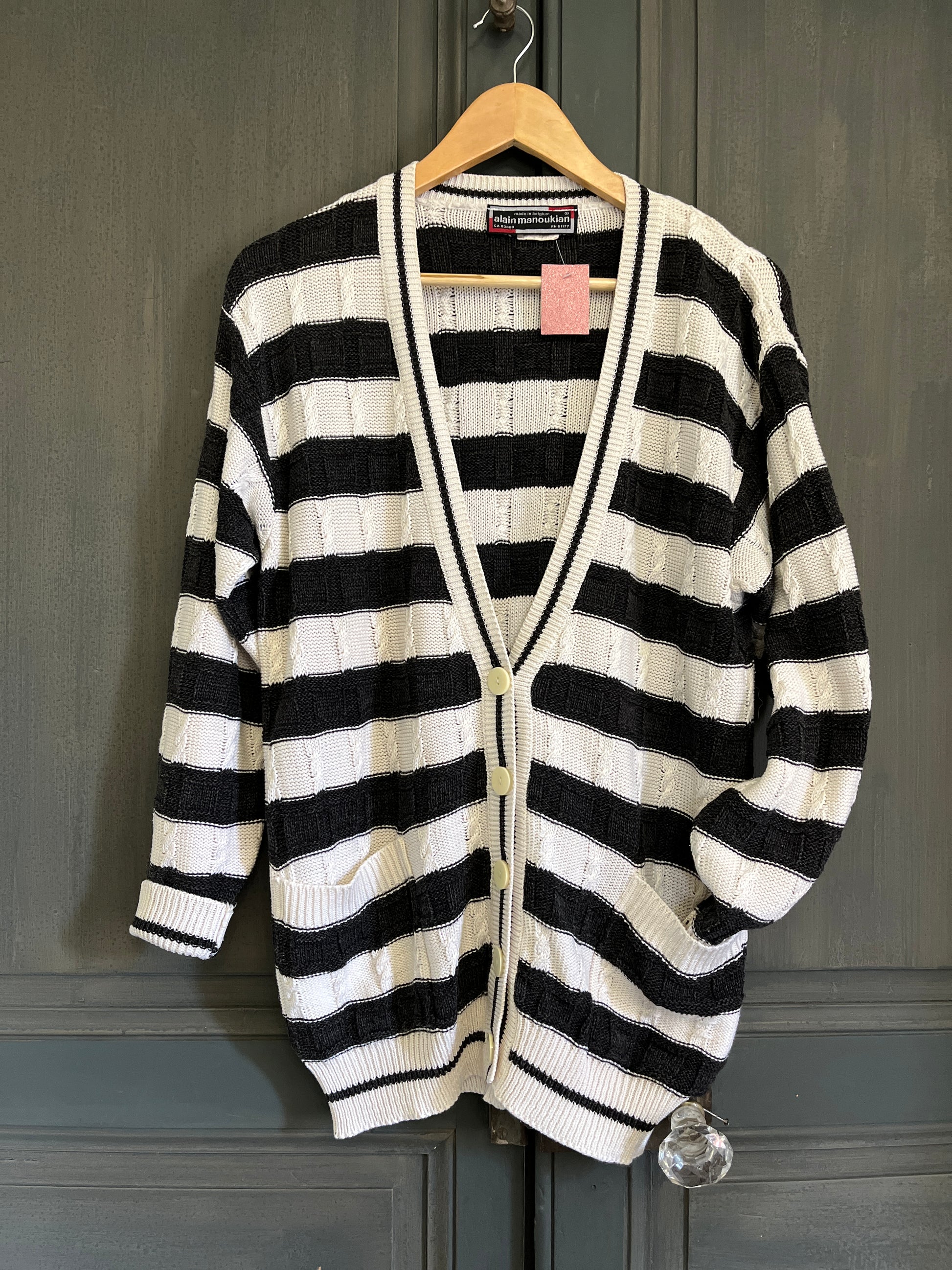 Gilet en tricot vintage de la marque Alain Manoukian. Pièce parfaite pour la mi-saison, il se distingue par son motif à rayures noir et blanc et sa maille texturée.