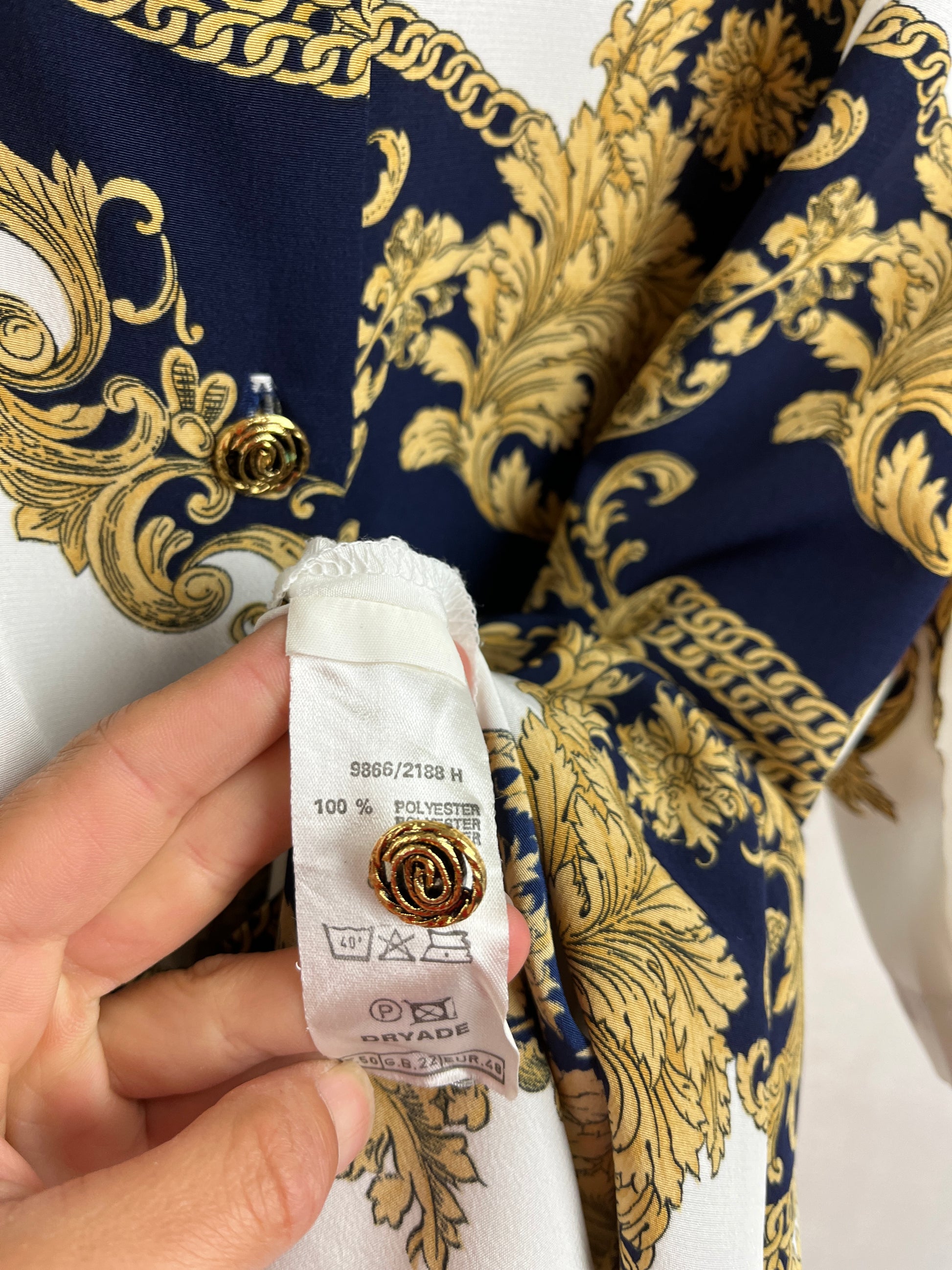 Affirmez votre style avec ce magnifique chemisier vintage aux motifs inspirés de l'esthétique baroque et des chaînes dorées, qui rappellent le luxe de la maison Versace. Ses couleurs contrastantes, bleu marine, blanc et doré, donnent une allure élégante et audacieuse.