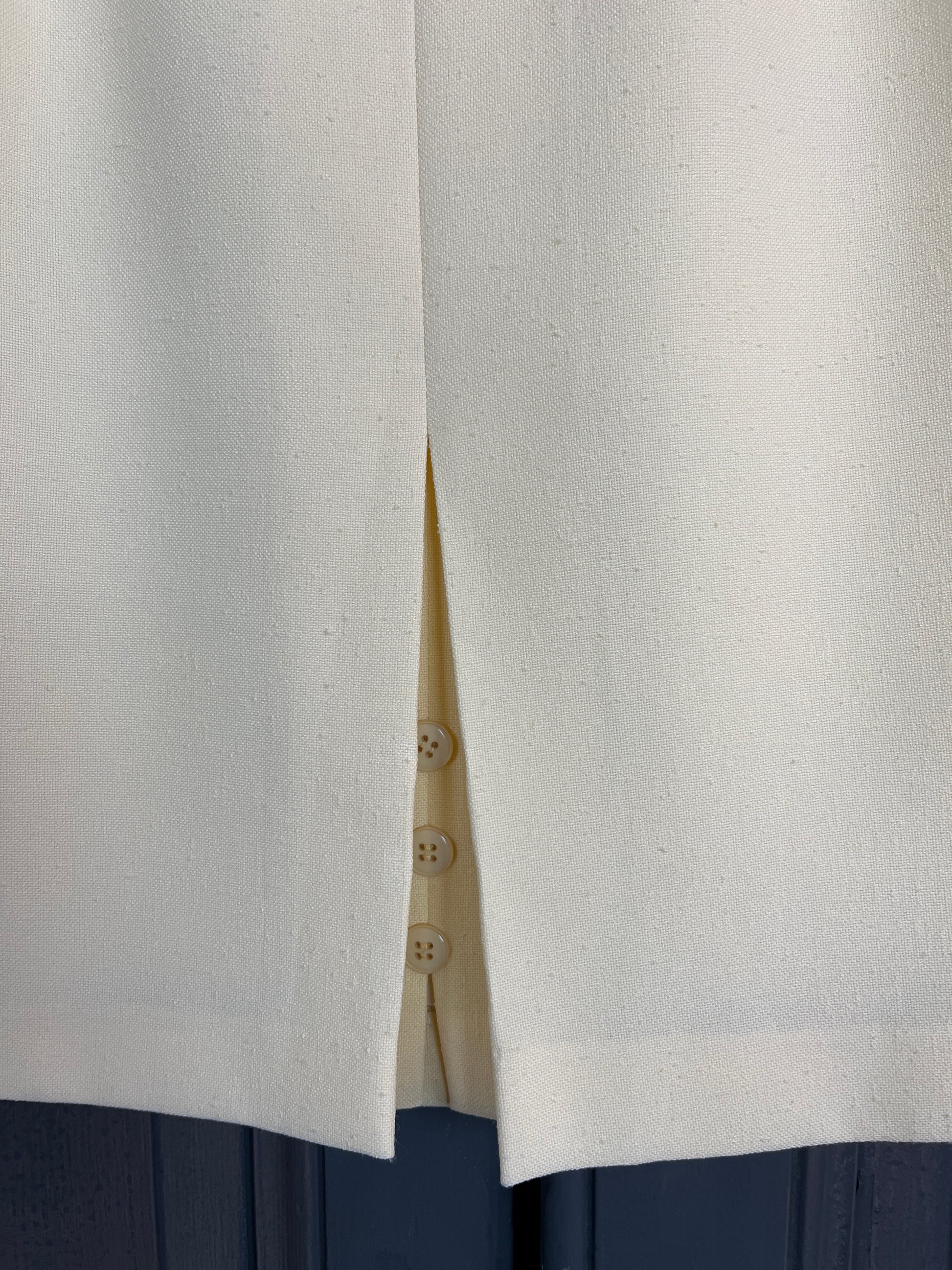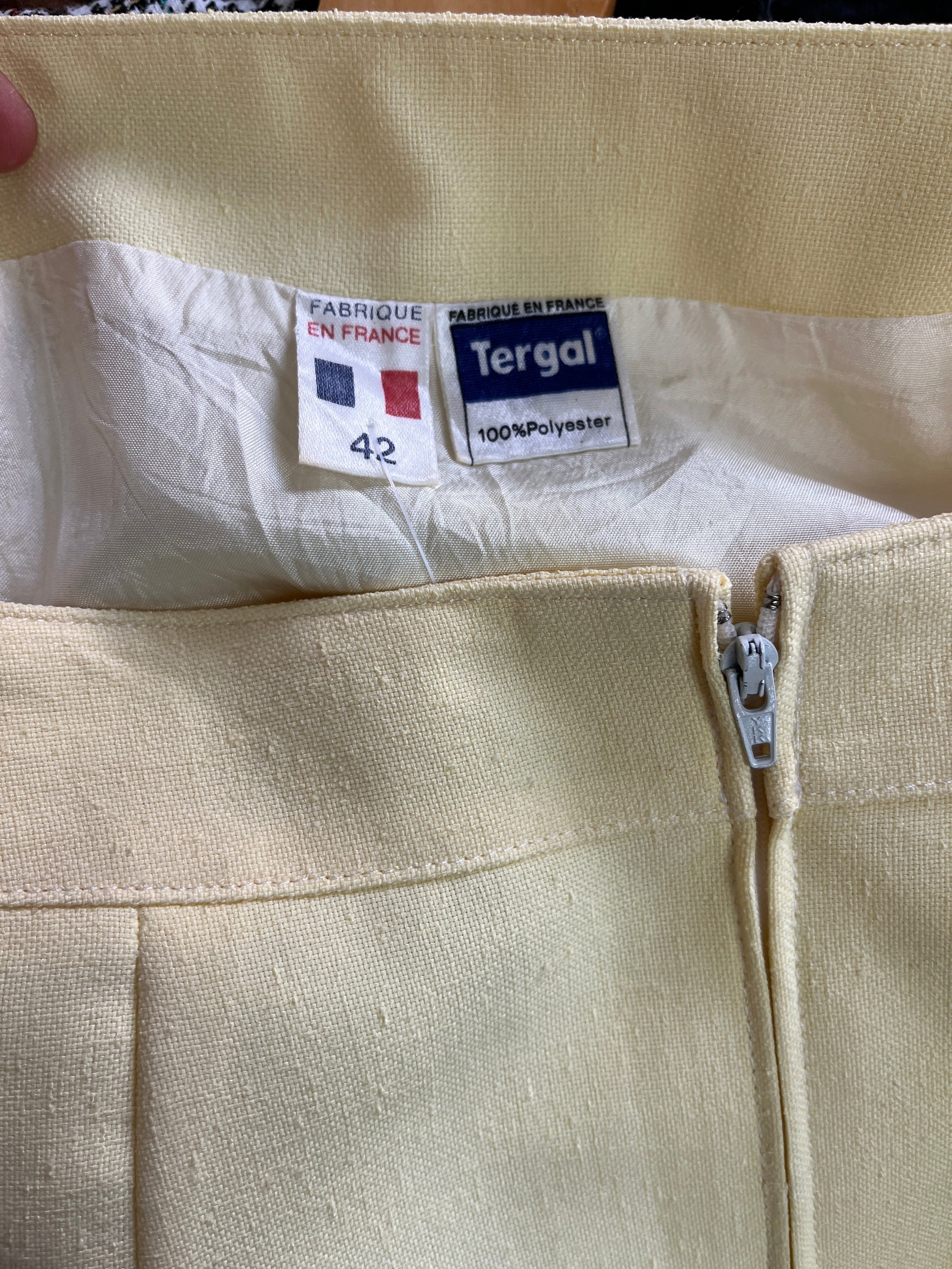 Adorable mini-jupe vintage d'une rare élégance, confectionnée en Tergal 100% Polyester pour une tenue impeccable et une texture légère. Sa teinte jaune crème lumineuse est parfaite pour la saison estivale. La coupe droite avec des plis délicats sur le devant assure une silhouette flatteuse et moderne.
