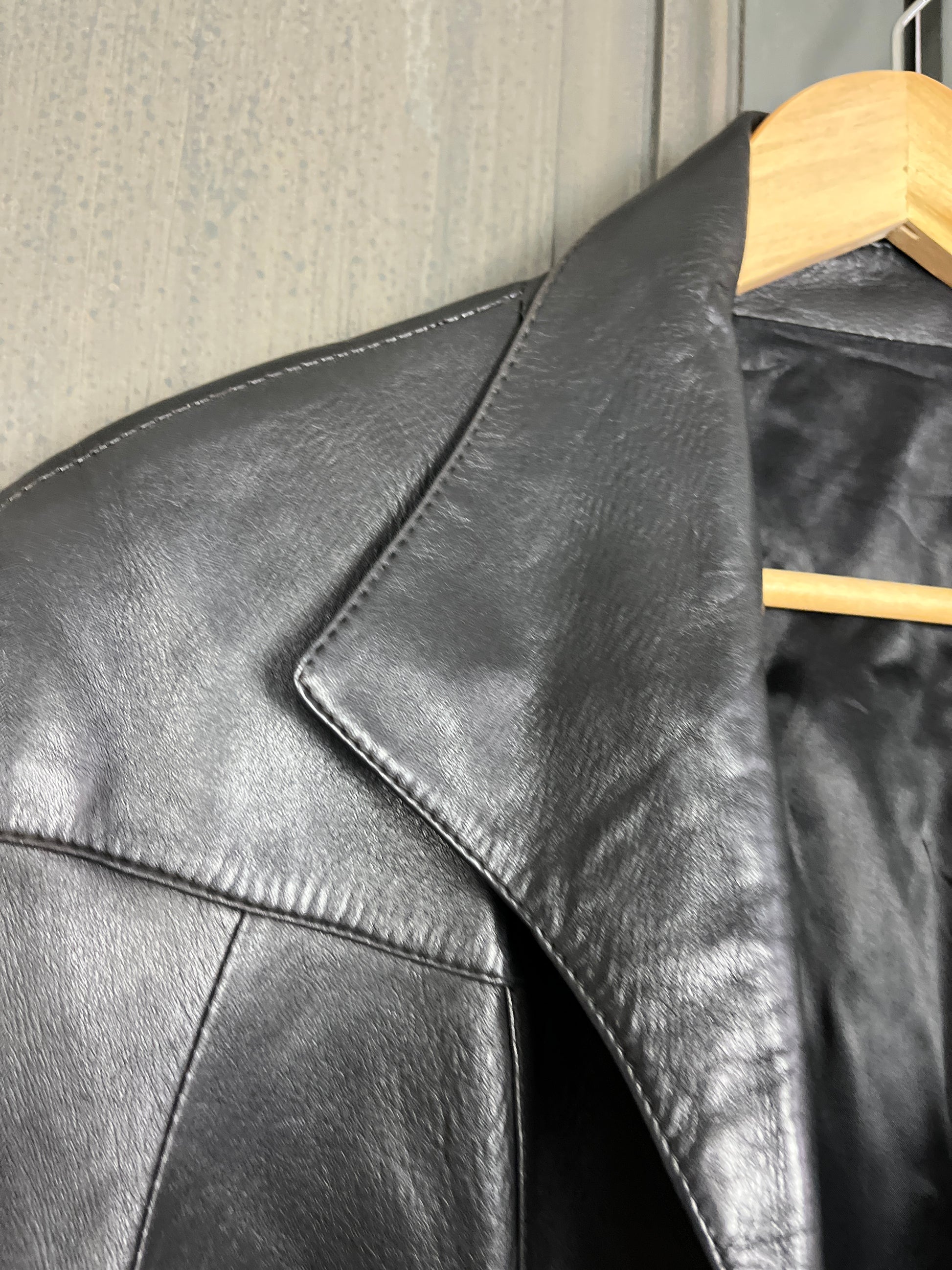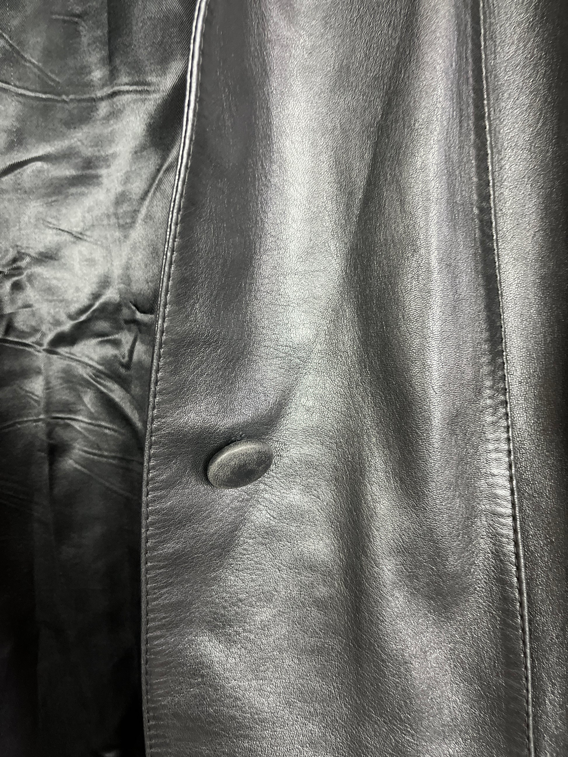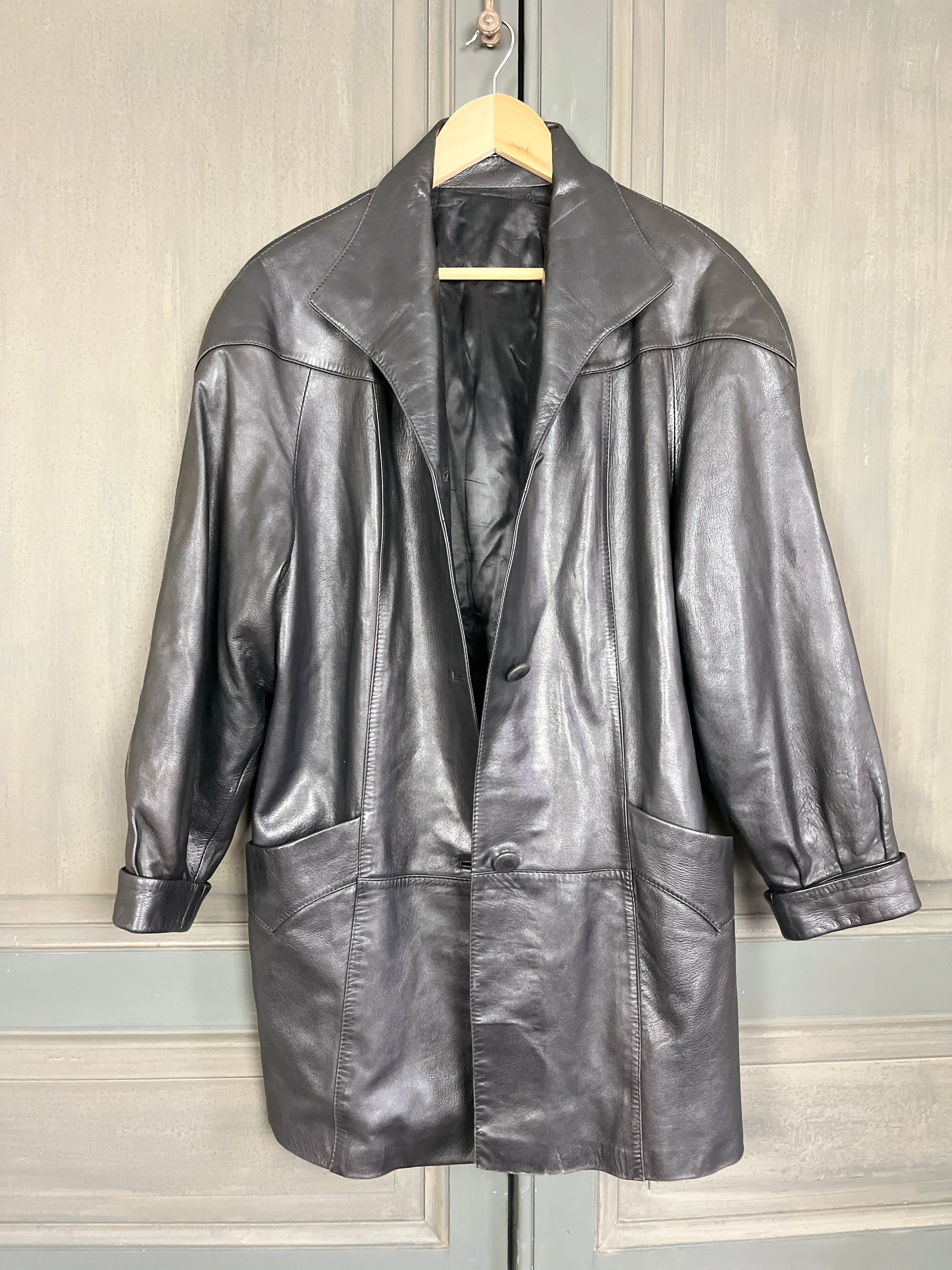Manteau mi-long en Cuir Véritable, Coupe Vintage Oversize Ce manteau en cuir noir est une pièce forte au style intemporel. Sa coupe oversize et mi-longue lui confère une allure vintage et moderne à la fois, idéale pour toutes les saisons. Le cuir véritable est souple et de belle qualité, avec des finitions soignées. Porte oversize en 40