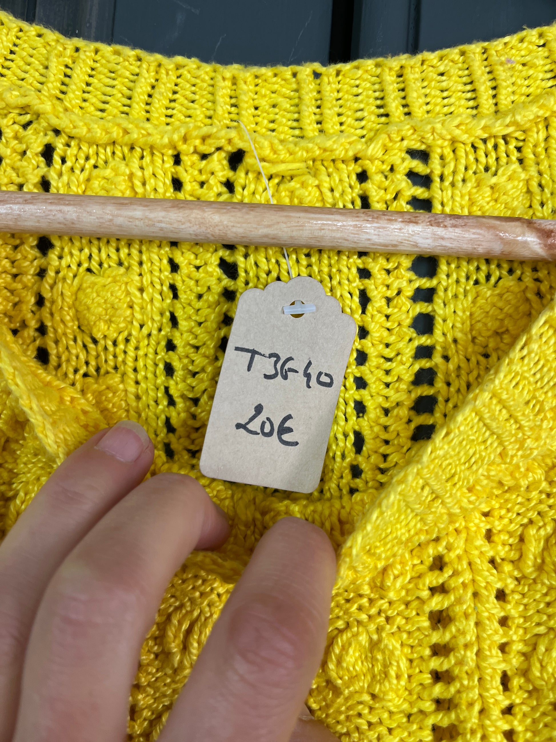 Ajoutez une touche de soleil à votre dressing avec ce pull court et lumineux. Sa couleur jaune vif et sa maille unique en font une pièce joyeuse et originale. Le tricot alterne des bandes de points ajourés en forme de petites fleurs et des côtes verticales, créant une texture visuelle et tactile très intéressante. Le col rond et les manches courtes en font un vêtement parfait pour les journées plus fraîches de l'été ou de la mi-saison.
