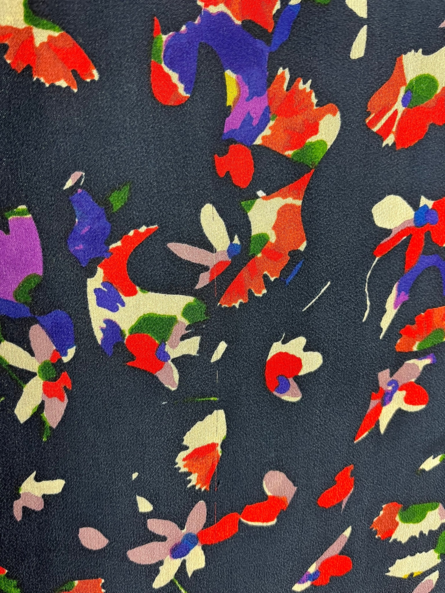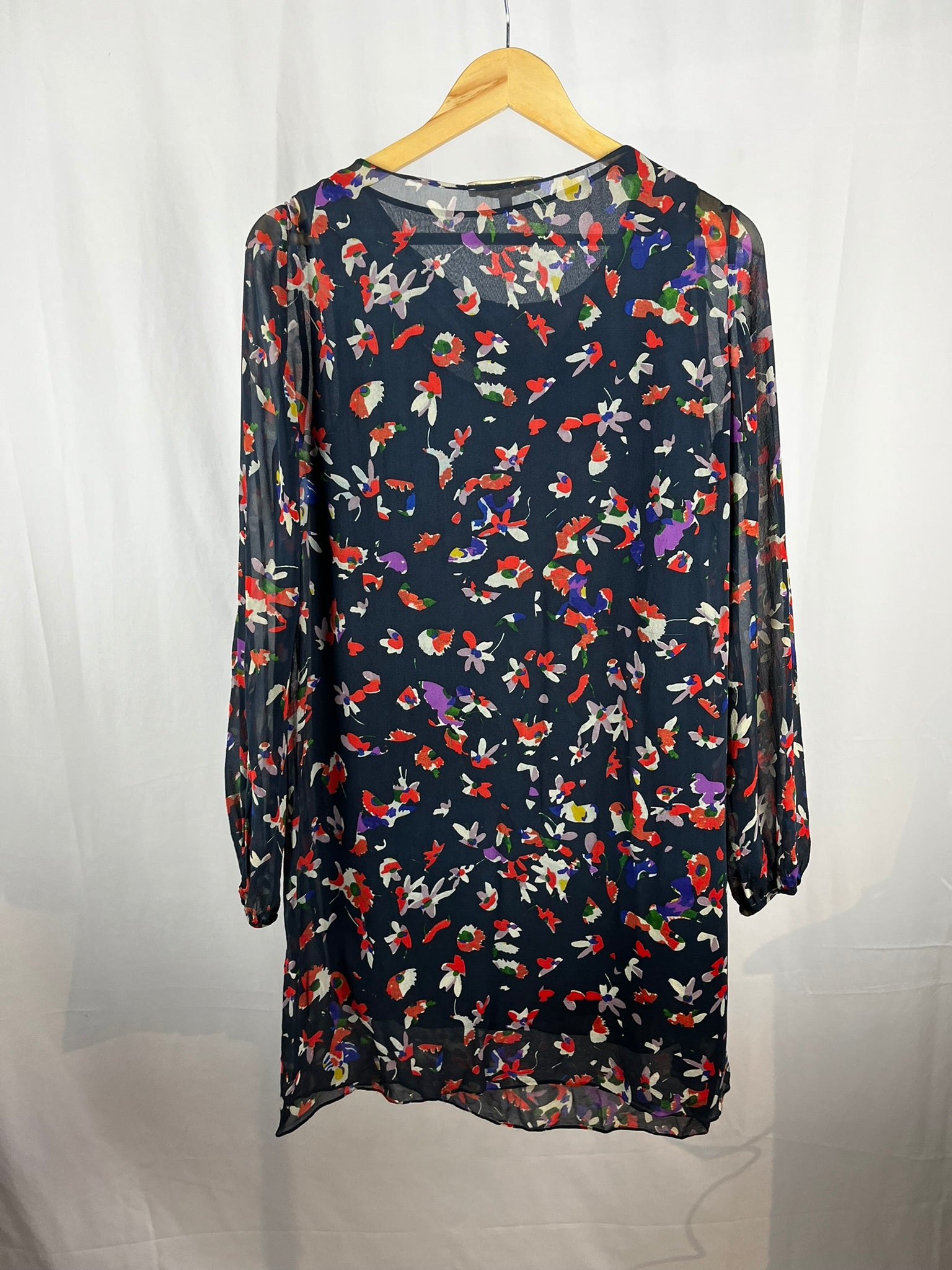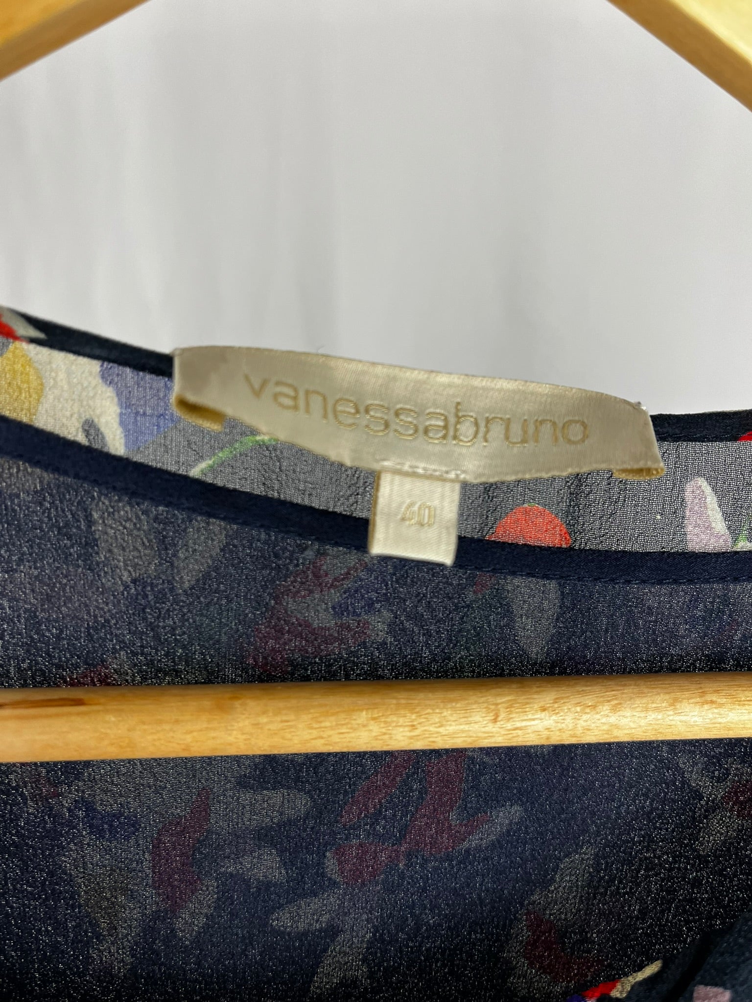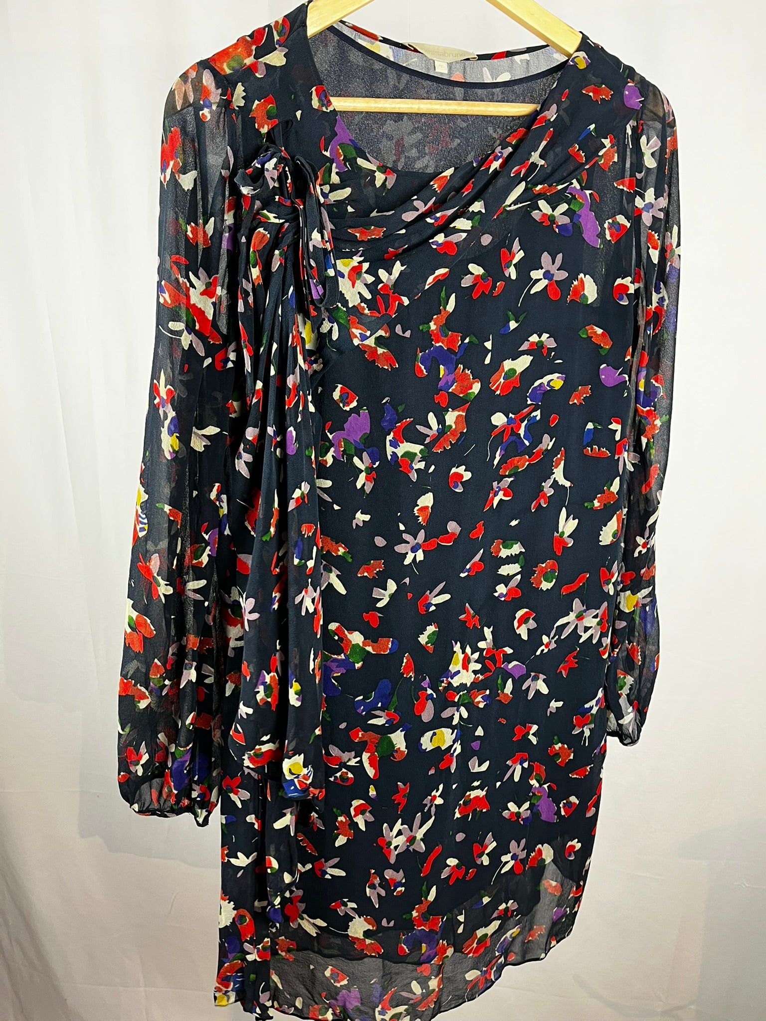 Elégante robe de seconde main signée Vanessa Bruno est un exemple parfait du style parisien chic et décontracté de la marque. La robe présente une silhouette fluide et drapée, confectionnée dans un tissu léger et semi-transparent, orné d'un magnifique imprimé floral. L'imprimé est une mosaïque de fleurs abstraites aux allures de coups de pinceau, dans des teintes vives de rouge, blanc, violet, vert et bleu, sur un fond bleu marine foncé.