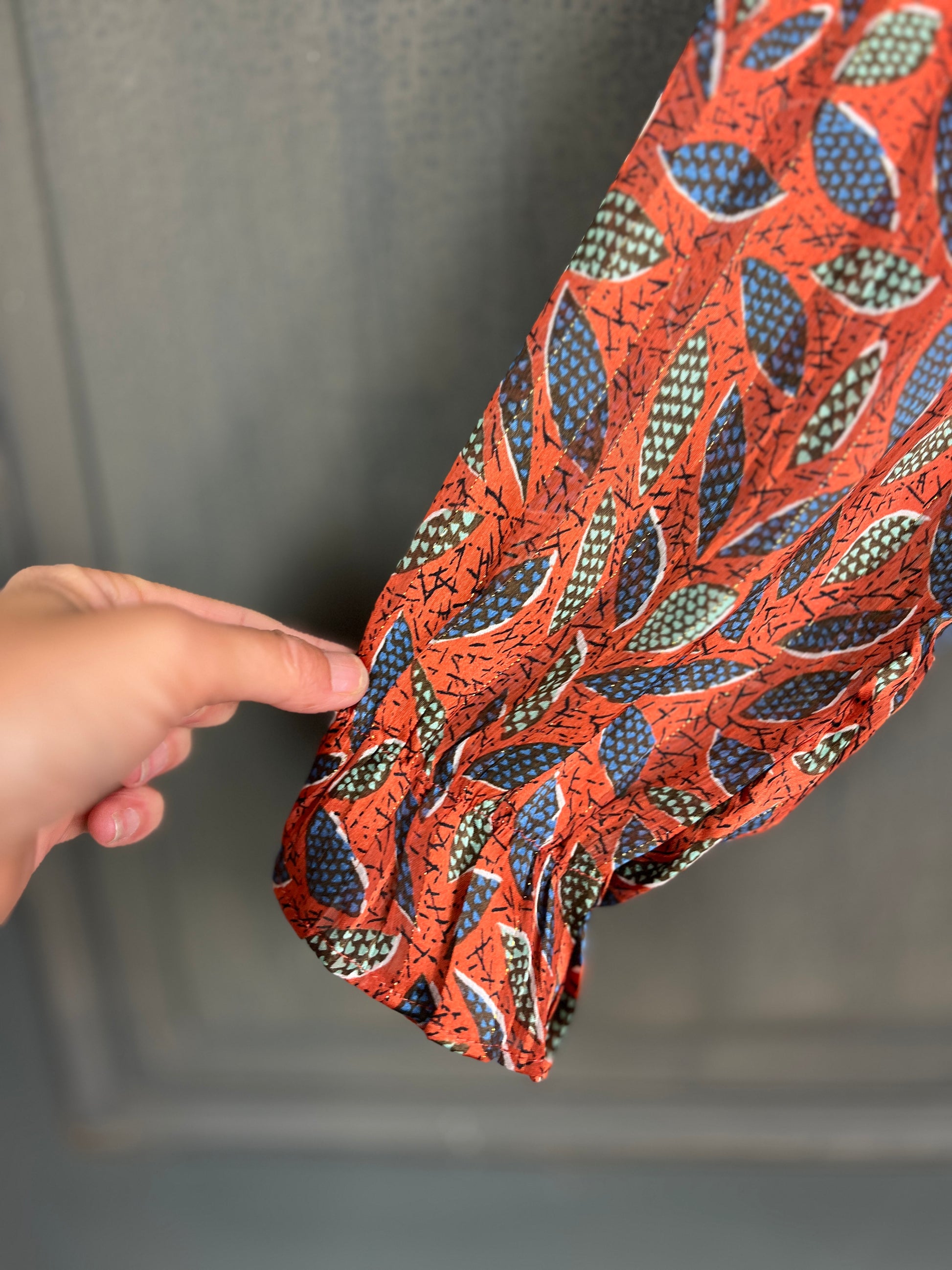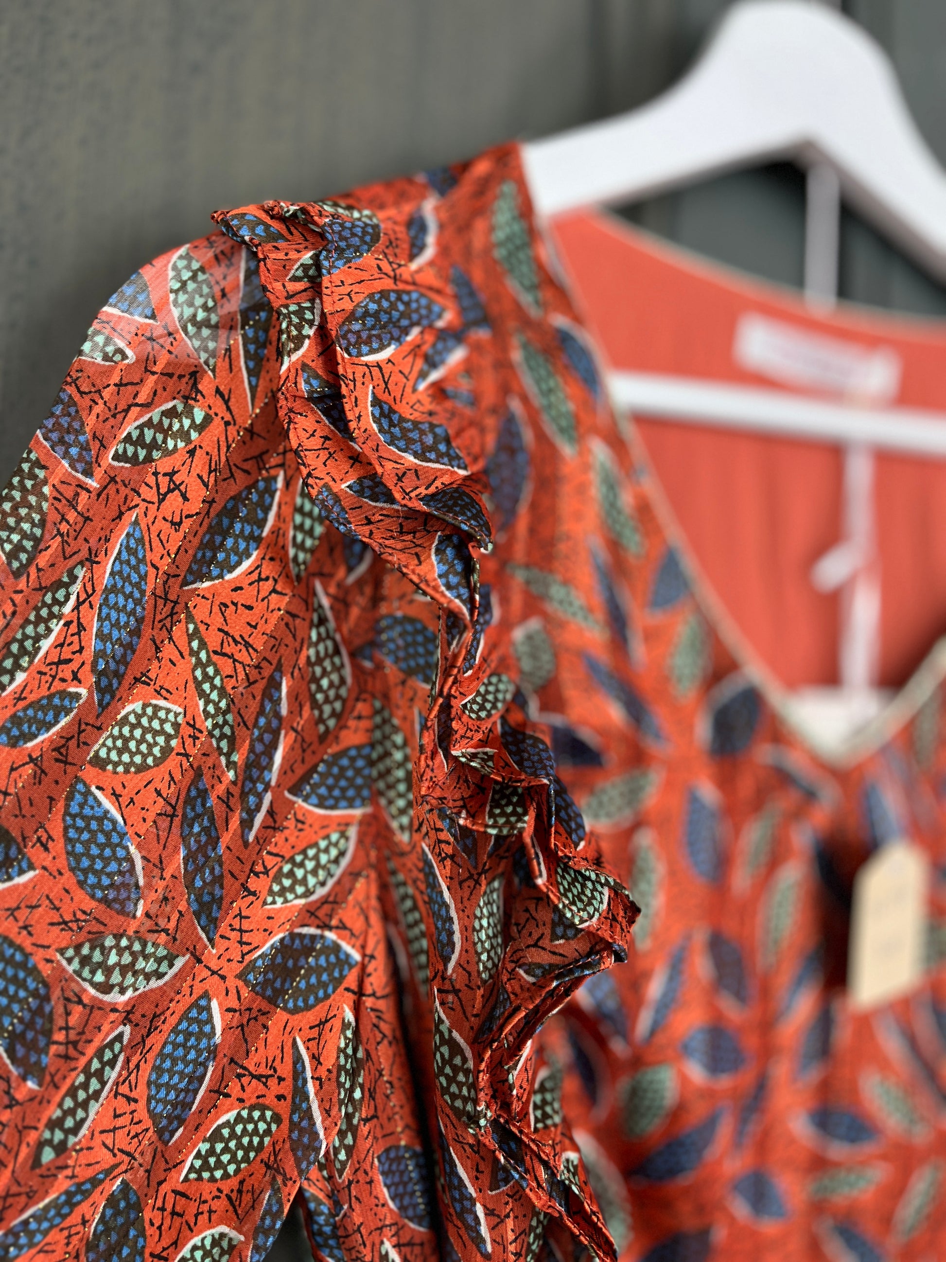 Découvrez cette robe courte, une pièce à la fois romantique et bohème, parfaite pour la mi-saison. Son tissu fluide et léger est sublimé par un imprimé feuillage stylisé aux teintes de bleu marine, vert et noir sur un fond terracotta ou rouille. L'encolure en V est élégamment bordée de volants qui se prolongent le long de la poitrine, tandis que les manches longues se terminent par des poignets à volants assortis. La taille est marquée par une ceinture à nouer, qui met la silhouette en valeur et assure un ajustement parfait.