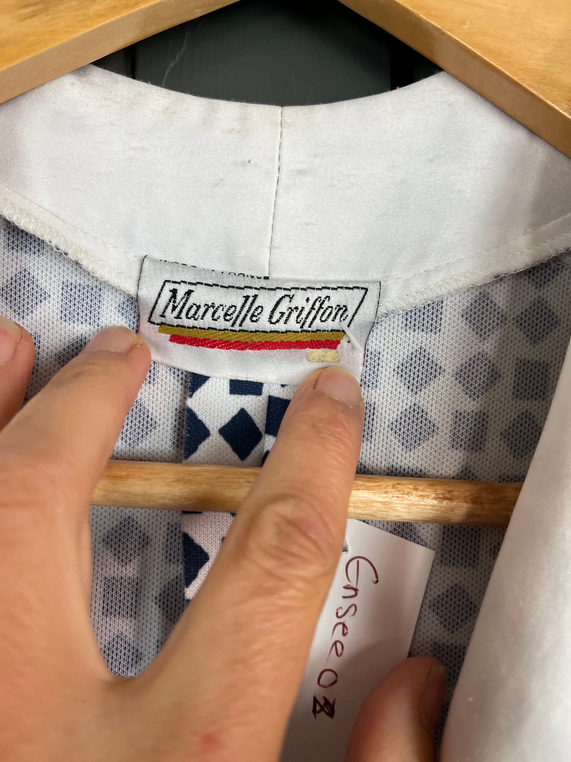 Adoptez une allure chic et rétro avec cette magnifique robe vintage à motif géométrique bleu marine sur fond blanc. Eelle séduit par sa coupe flatteuse, ses finitions contrastées et son élégance intemporelle.