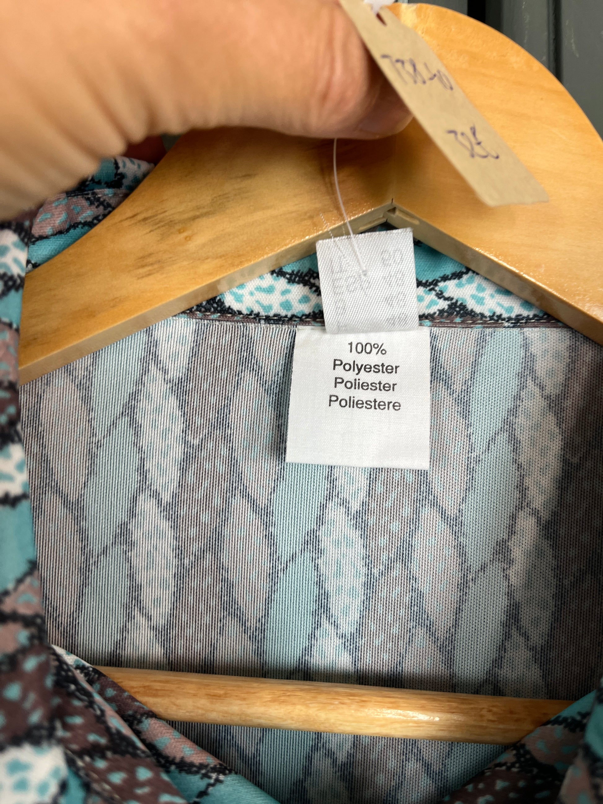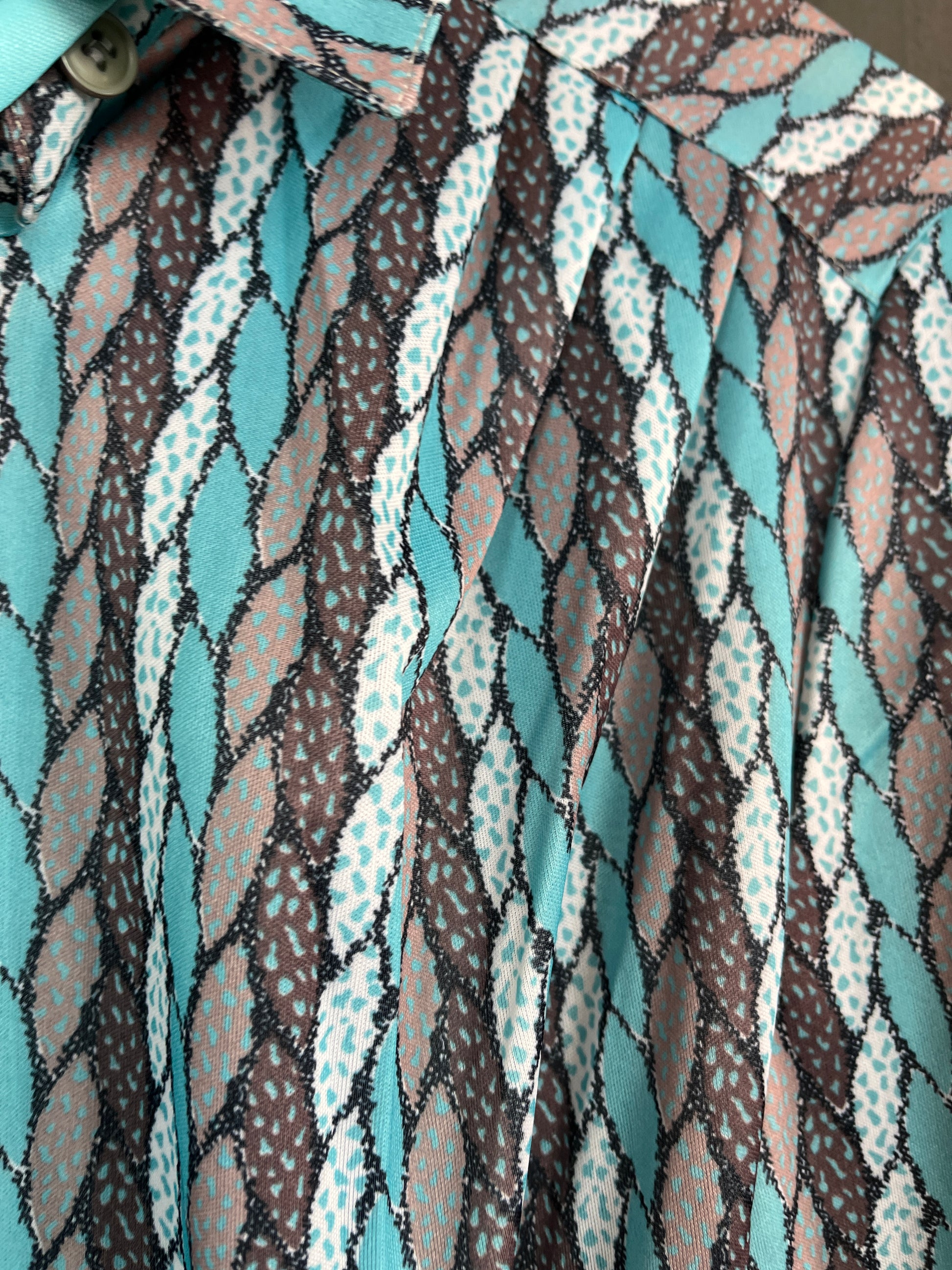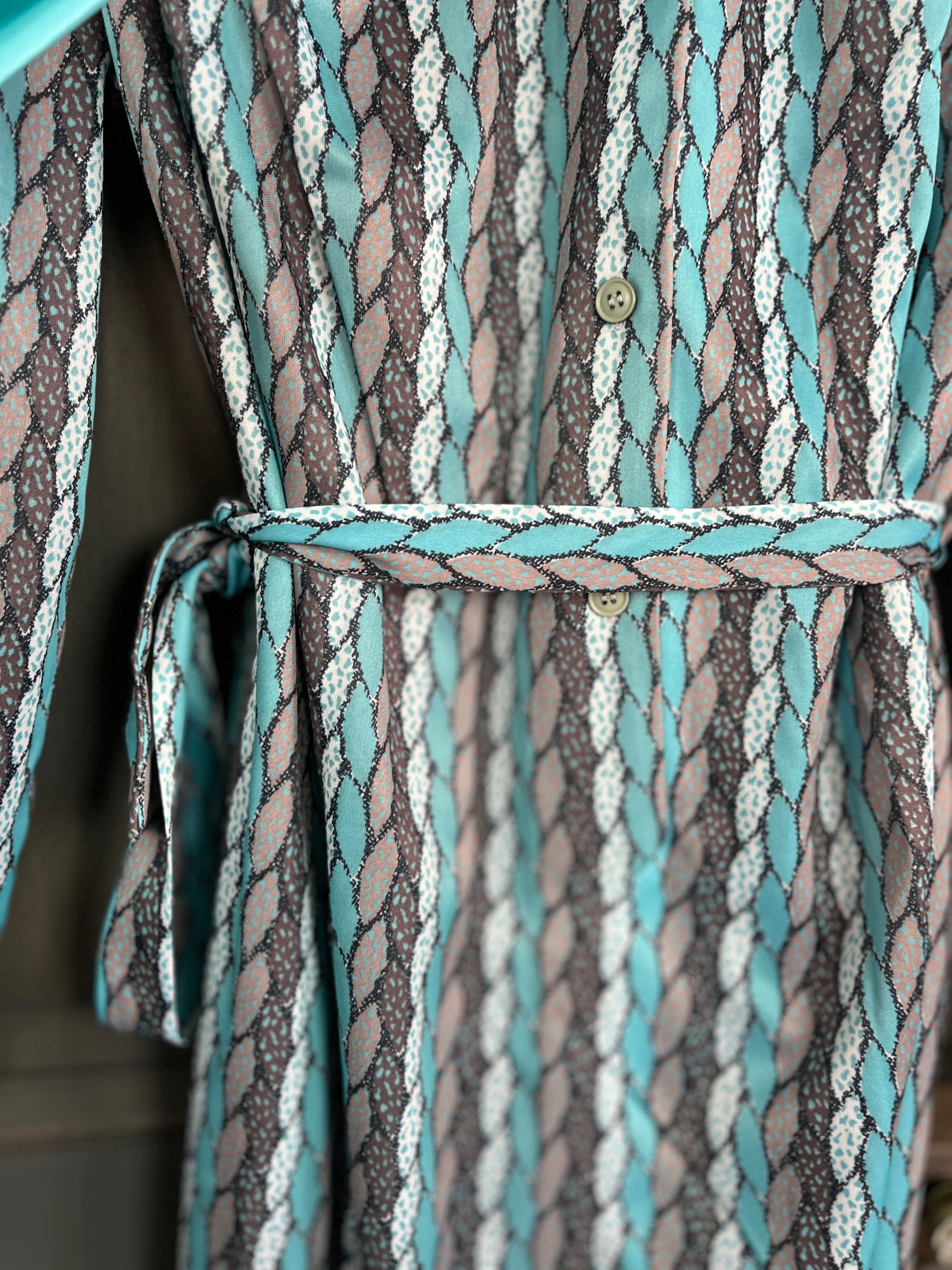 Robe vintage à motif graphique bleu et noir – style années 70