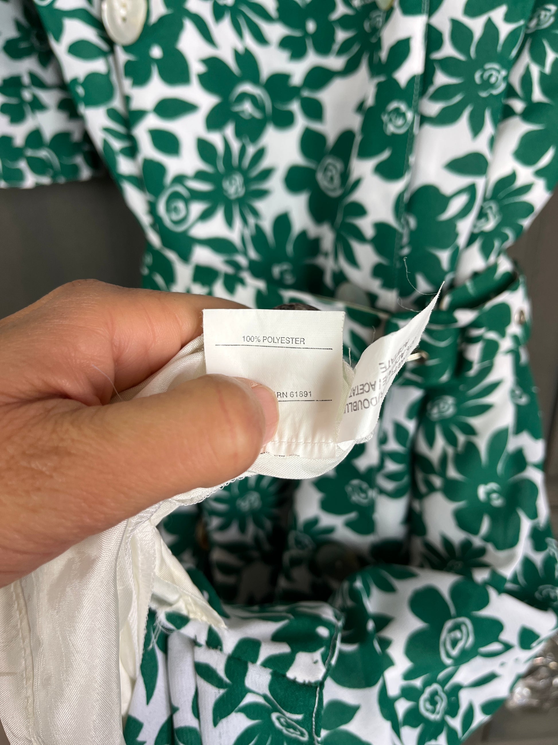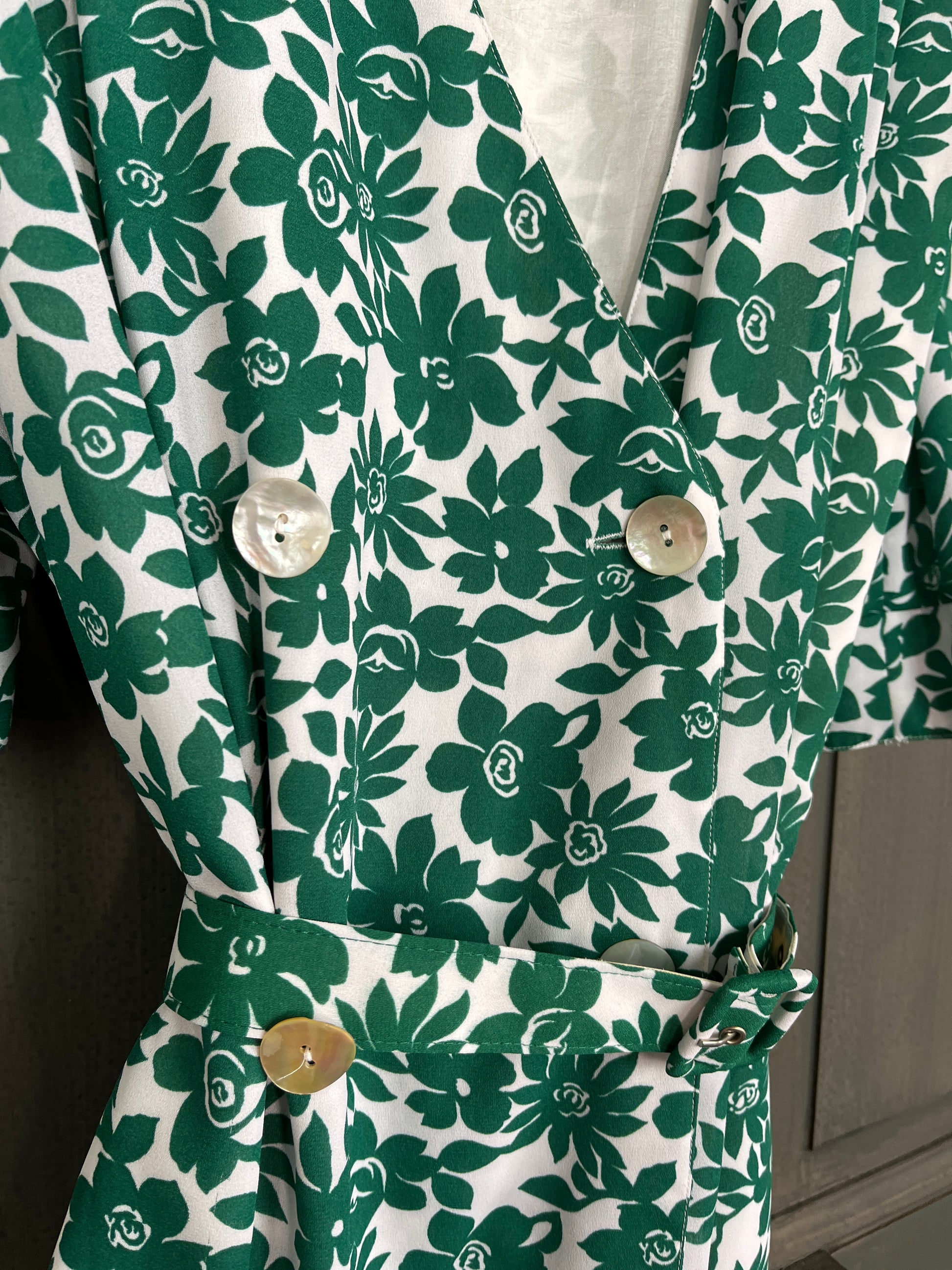 Offrez-vous une touche de fraîcheur avec cette sublime robe vintage à motif floral vert foncé sur fond blanc. Son design croisé et cintré souligne la taille avec élégance, tandis que les boutons décoratifs et les manches courtes bouffantes apportent une vraie personnalité rétro.