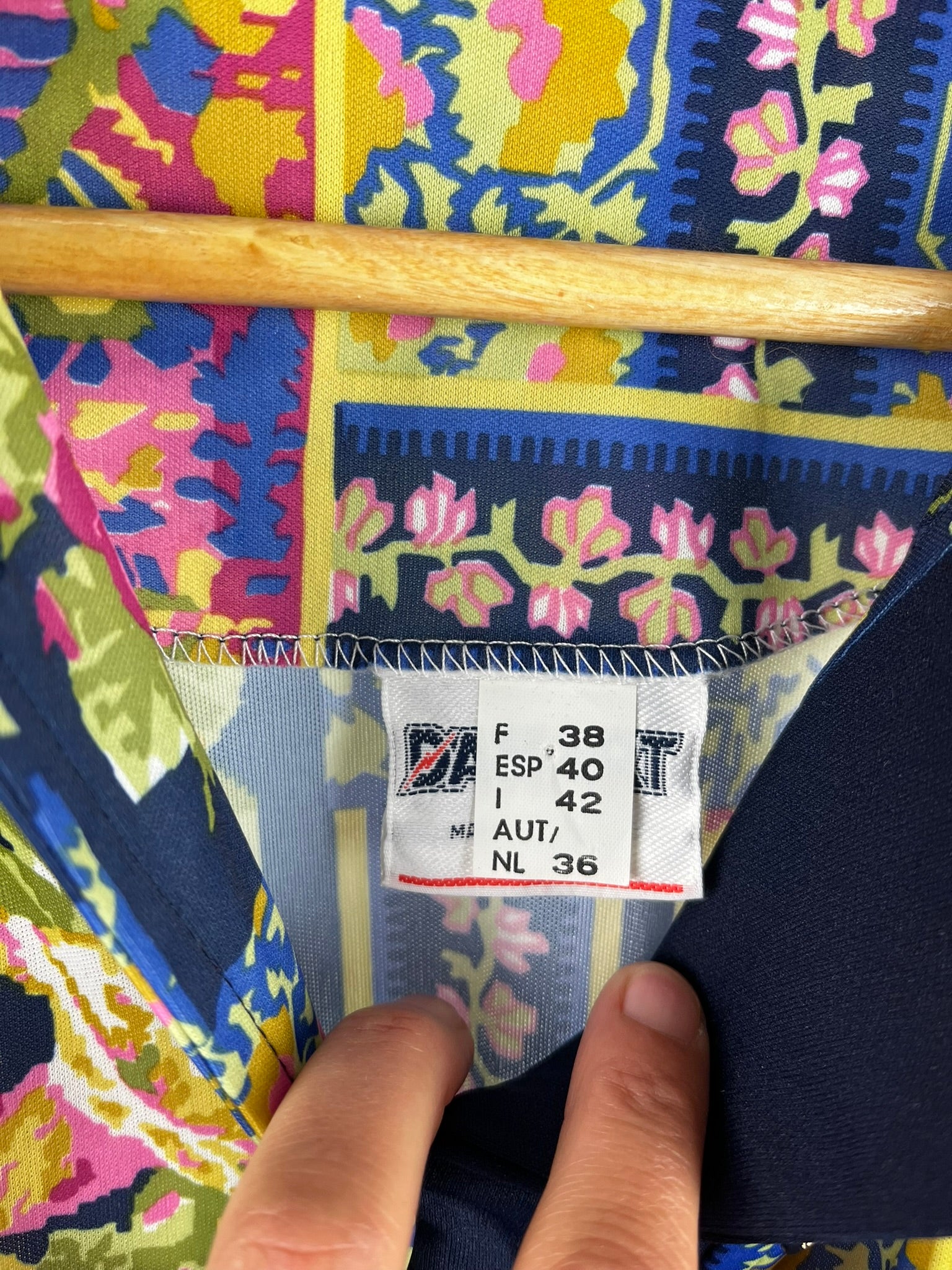 Plongez dans l'élégance des années 80 avec cette robe vintage unique. Son design audacieux et ses motifs colorés se marient à une coupe structurée pour créer une silhouette à la fois chic et originale. C'est la pièce parfaite pour un style affirmé qui allie charme du passé et modernité.