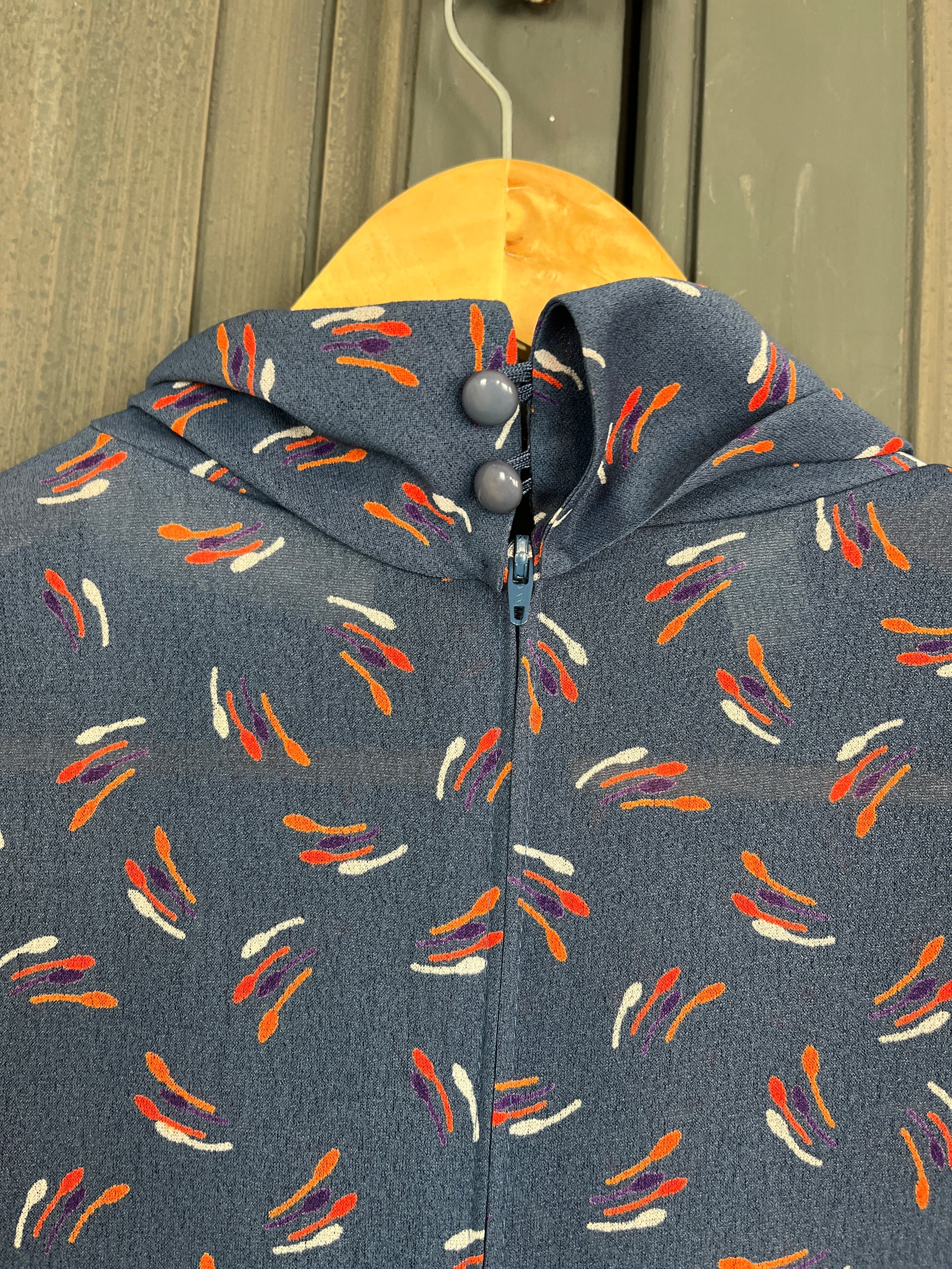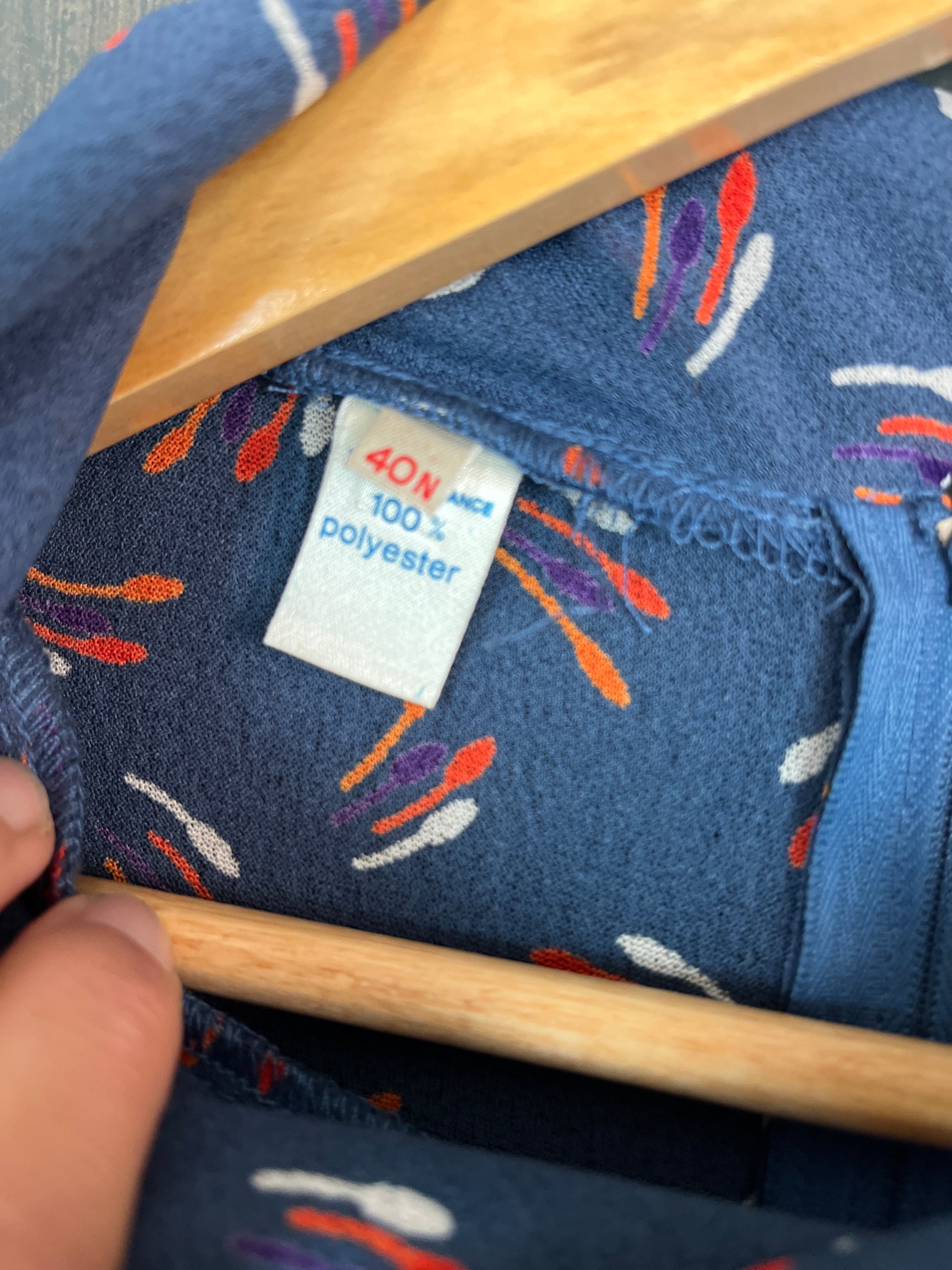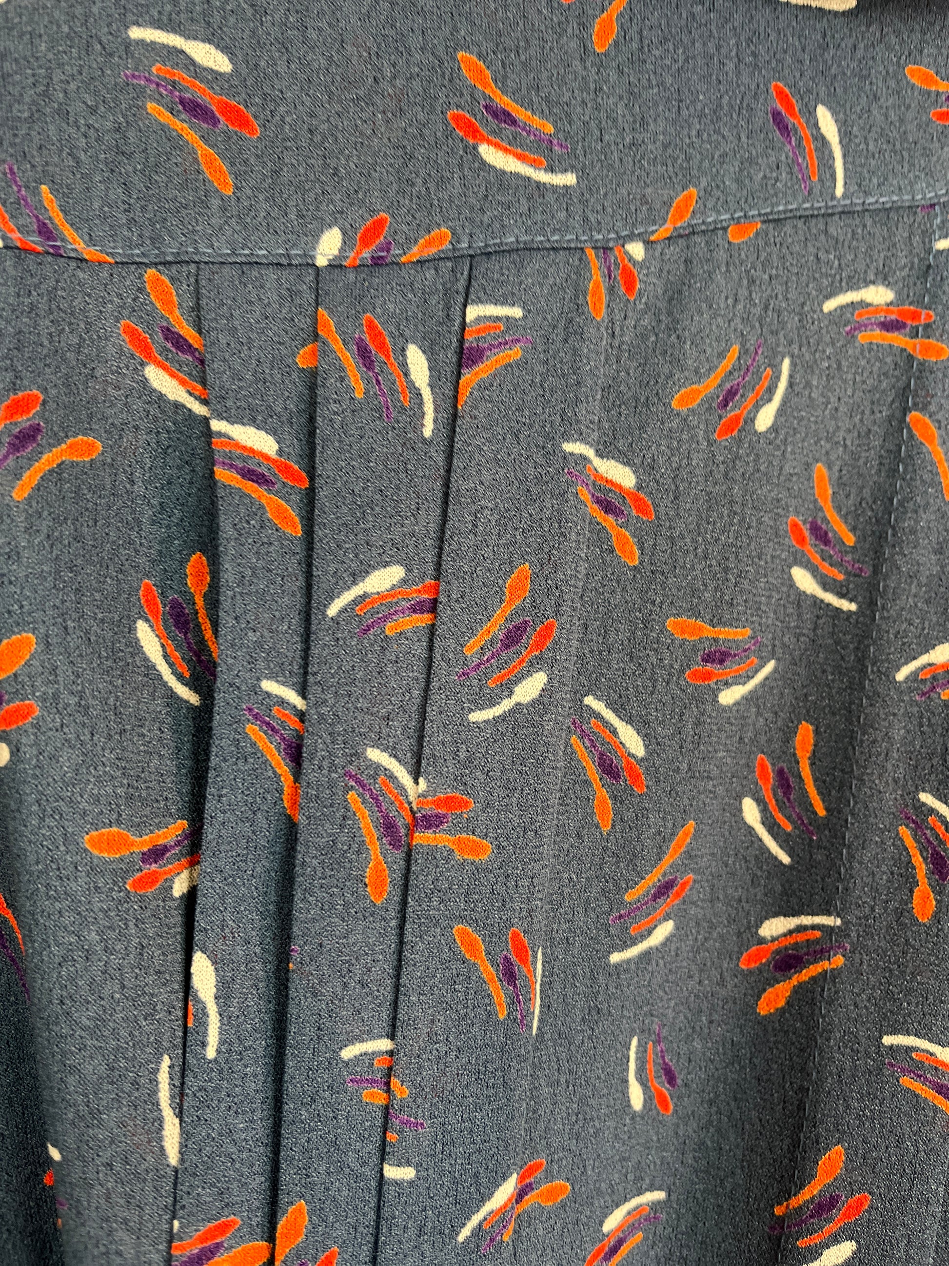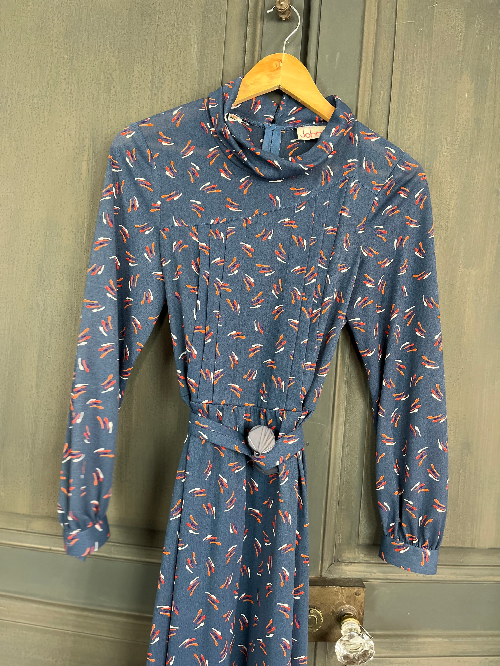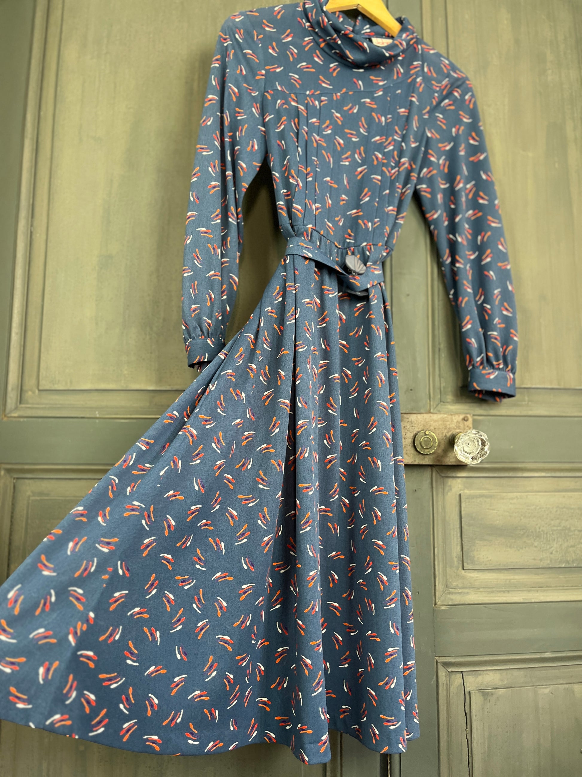 Plongez dans le charme des années 70 avec cette superbe robe vintage bleu nuit au tombé fluide. Son imprimé délicat de petites plumes multicolores (rouge, violet et blanc) lui confère une allure joyeuse et raffinée, typique de la mode rétro.