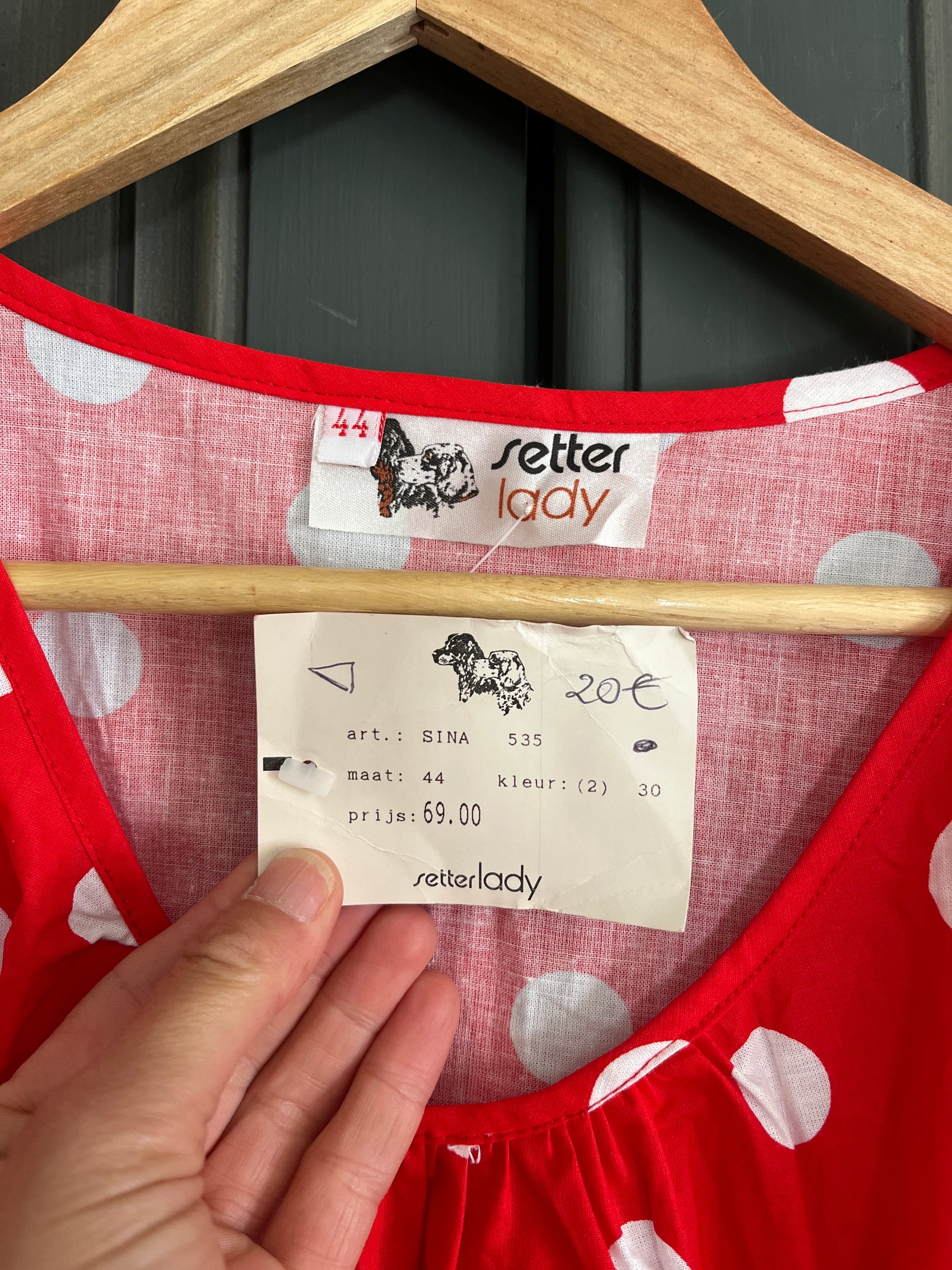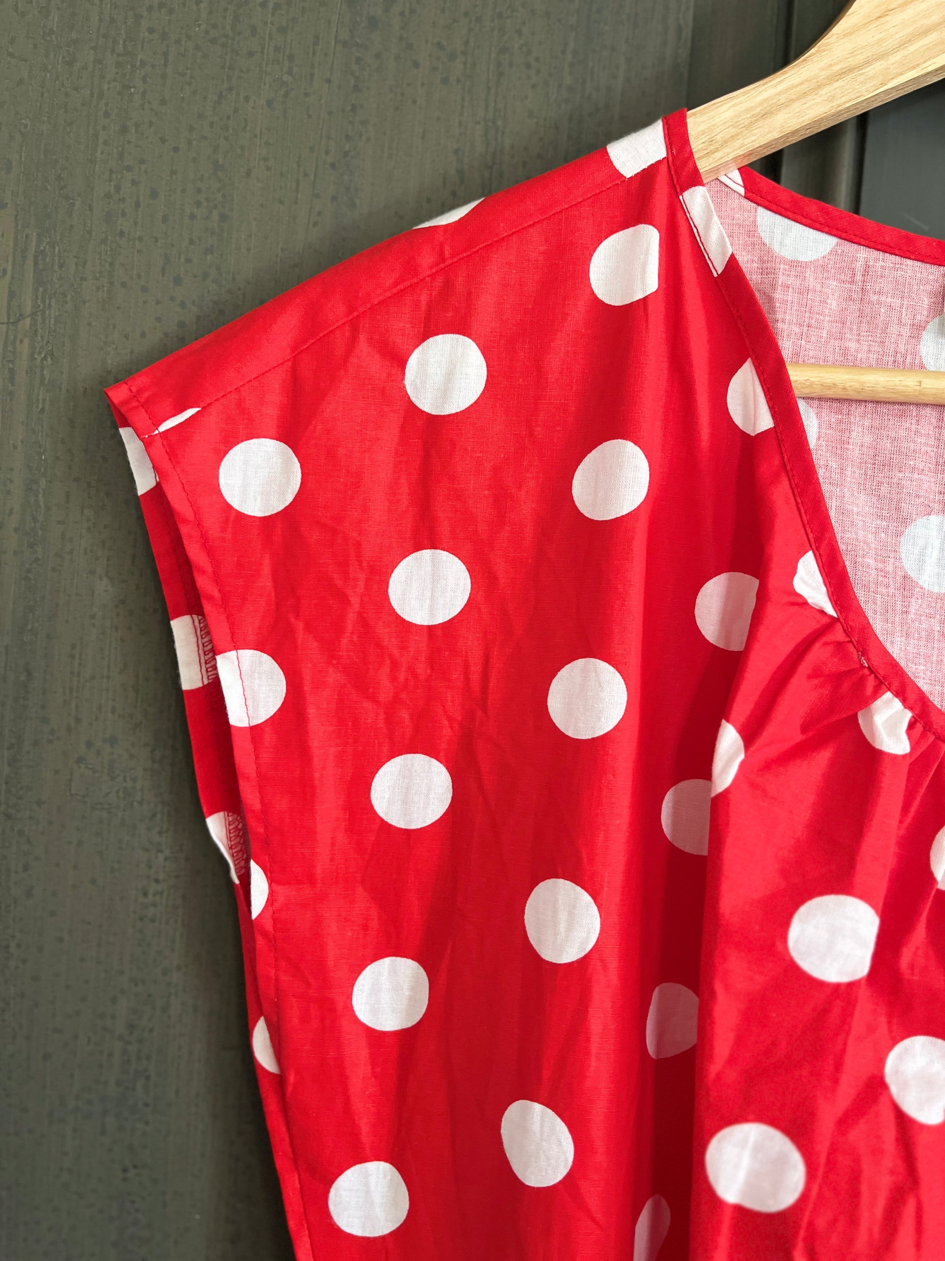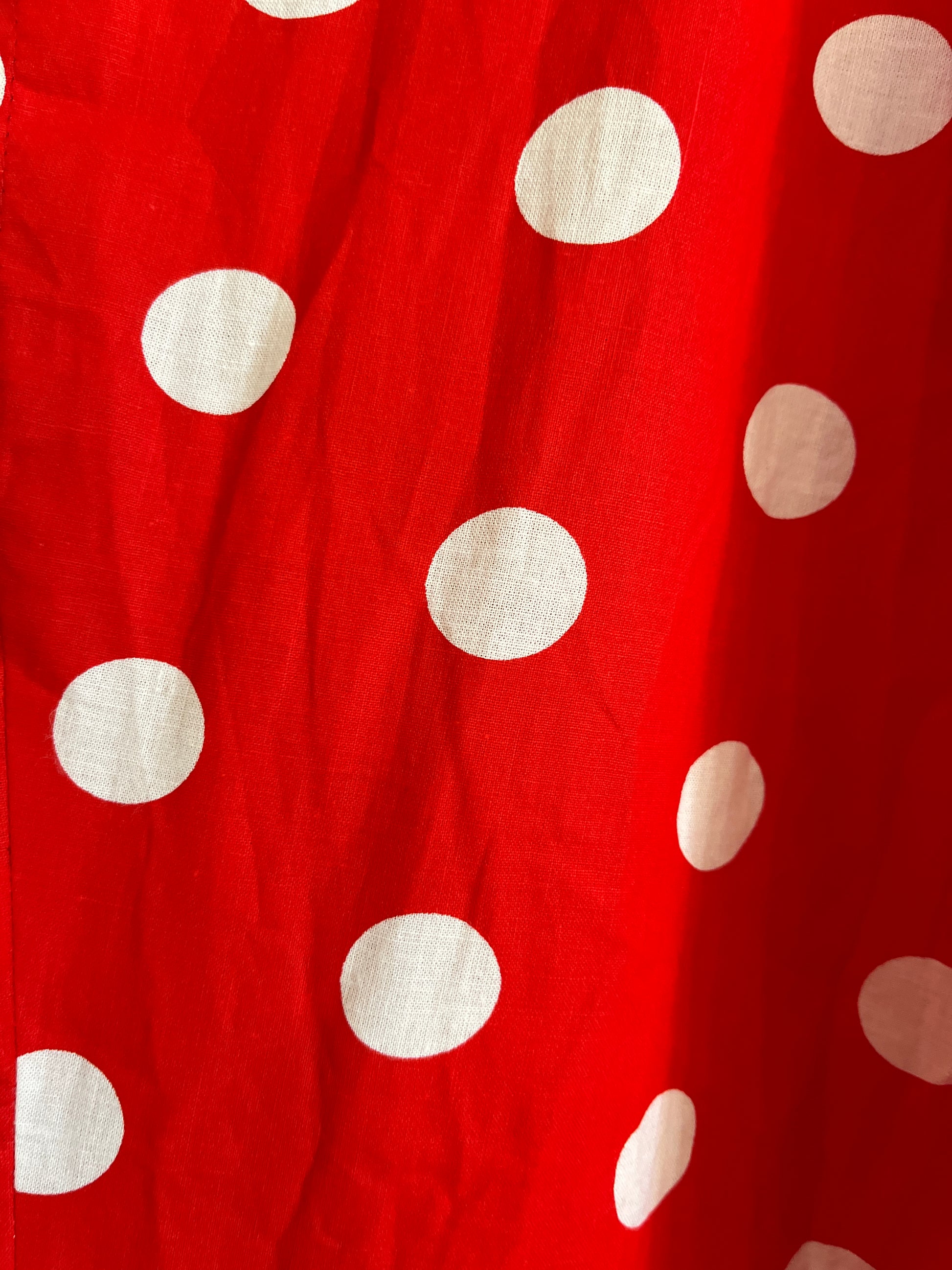 Magnifique robe vintage rouge vif à pois blancs, parfaite pour un look pin-up ou rockabilly. Coupe droite et fluide avec manches courtes légèrement tombantes. Le tissu léger et respirant en fait une pièce idéale pour l'été.